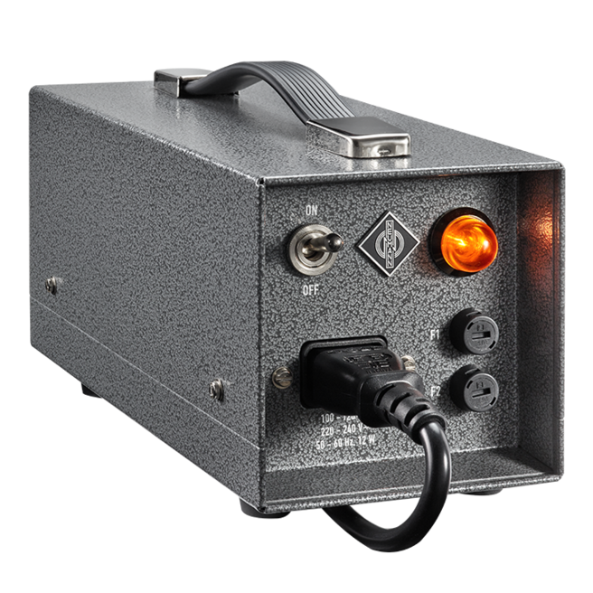 The NU 67 V power supply generates the operating voltages for all U 67 tube microphone. This classical power supply unit contains a mains transformer. It automatically switches between the 100-120 V and 220-240 V ac mains voltage ranges. Mains power is connected through a standard IEC 320 C14 socket. The microphone connects via a UC 5 cable. The microphone signal is fed to a XLR 3 M connector. The modulation output is transformer balanced.