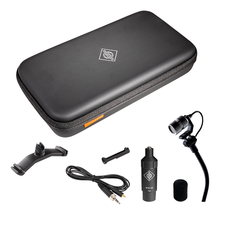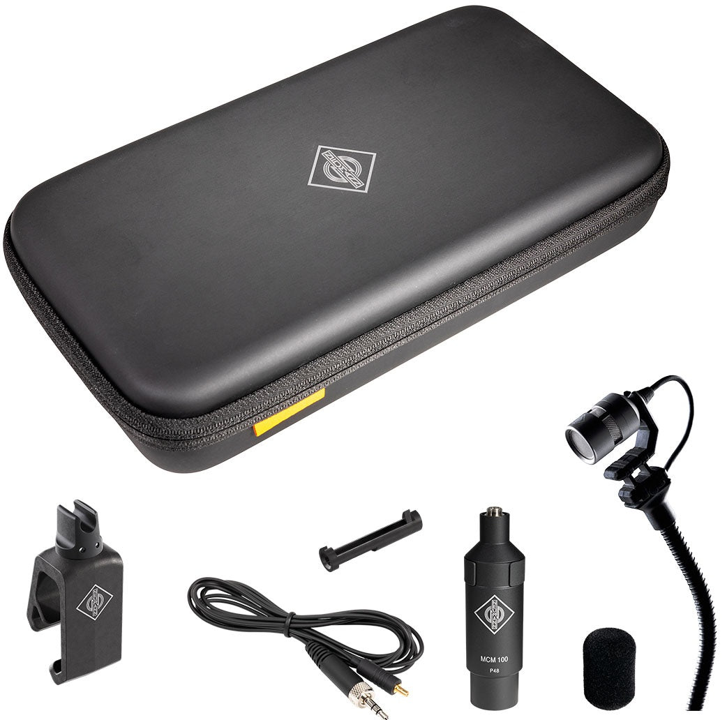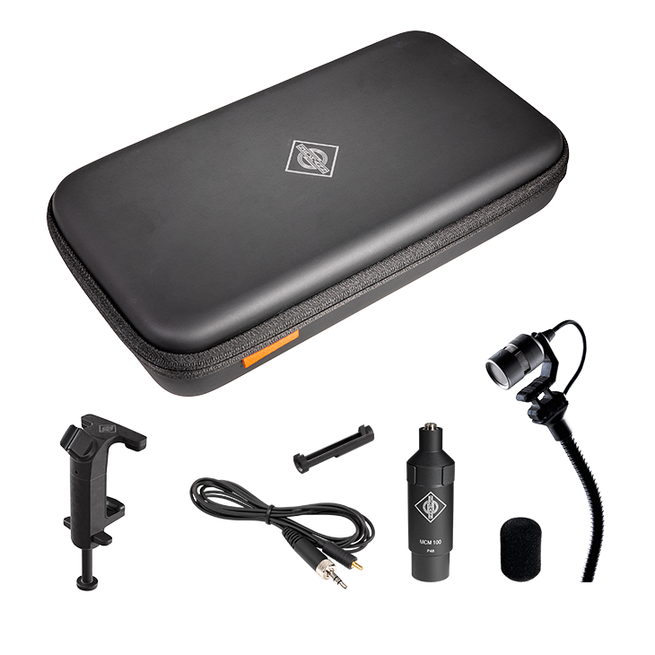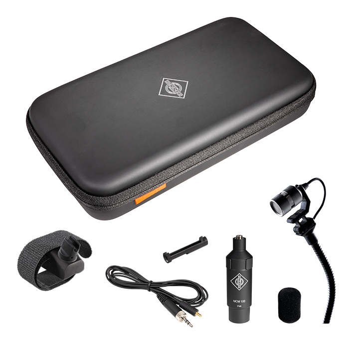 Complete set for using the Miniature Clip Mic system on the bell of a trumpet, trombone, saxophone or other horn, on percussion instruments and on pole stands. Contains: KK 14 capsule, SH 150 gooseneck, KC 1 cable brace, AC 31 cable, MCM 100 output stage, WS 110 wind shield, MC 6 clip. Delivered in a handy soft case.
