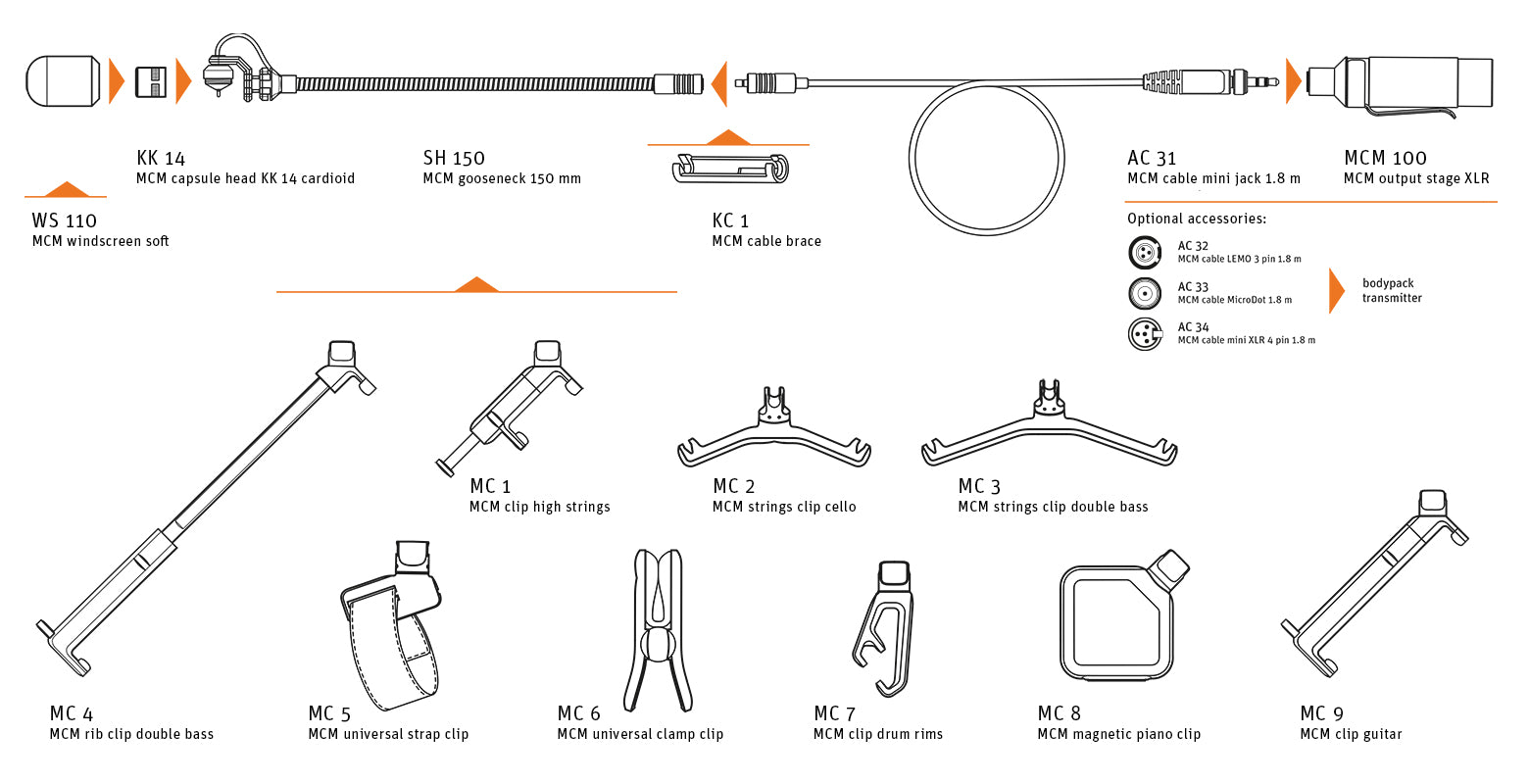 Complete set for using the Miniature Clip Mic system on an oboe, clarinet, flute, recorder, harp or bassoon. Contains: KK 14 capsule, SH 150 gooseneck, KC 1 cable brace, AC 31 cable, MCM 100 output stage, WS 110 wind shield, MC 5 clip. Delivered in a handy soft case.