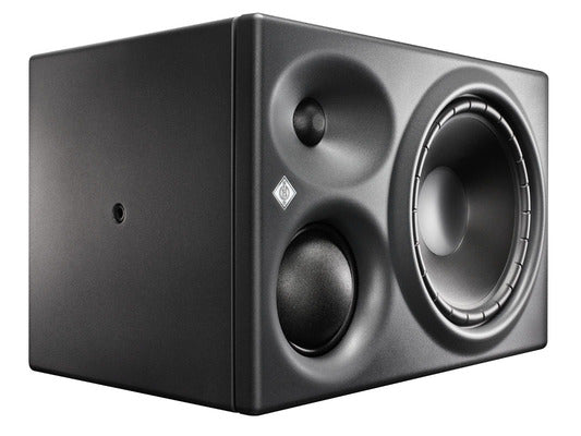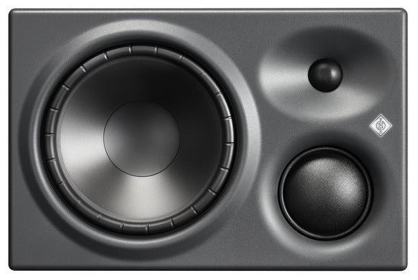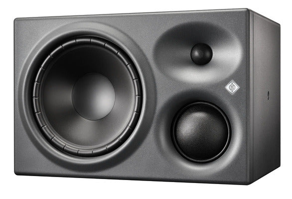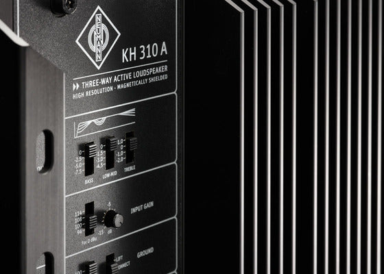 The KH 310 is a three-way tri-amplified monitor with thermally protected Class AB amplifiers (210 W and two times 90 W). Its Mathematically Modeled Dispersion™ (MMD™) waveguide delivers sound waves into the room with superior accuracy. The drivers are modeled using Neumann’s in-house developed software, which reduces non-linear distortion in every situation. Sound distributed in a horizontally precise manner ensures flexibility in the listening position; the narrower vertical dispersion reduces the negative effects of nearby reflections, for example from a desk or mixing console. The precisely controlled dispersion characteristics optimize reproduction in different room configurations and the response is extremely adaptable through various acoustical control settings.